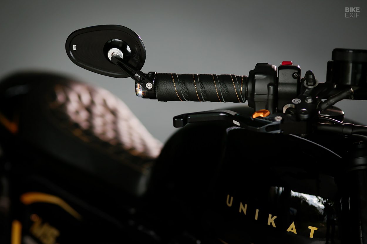 Adding to the bike’s modern touches are the Motogadget bar-end turn signals and mirrors. These components are renowned for their minimalistic design and high functionality, maintaining the bike’s clean lines while ensuring safety and visibility. Motogadget products are known for their quality and reliability, making them a perfect fit for this high-end custom build.