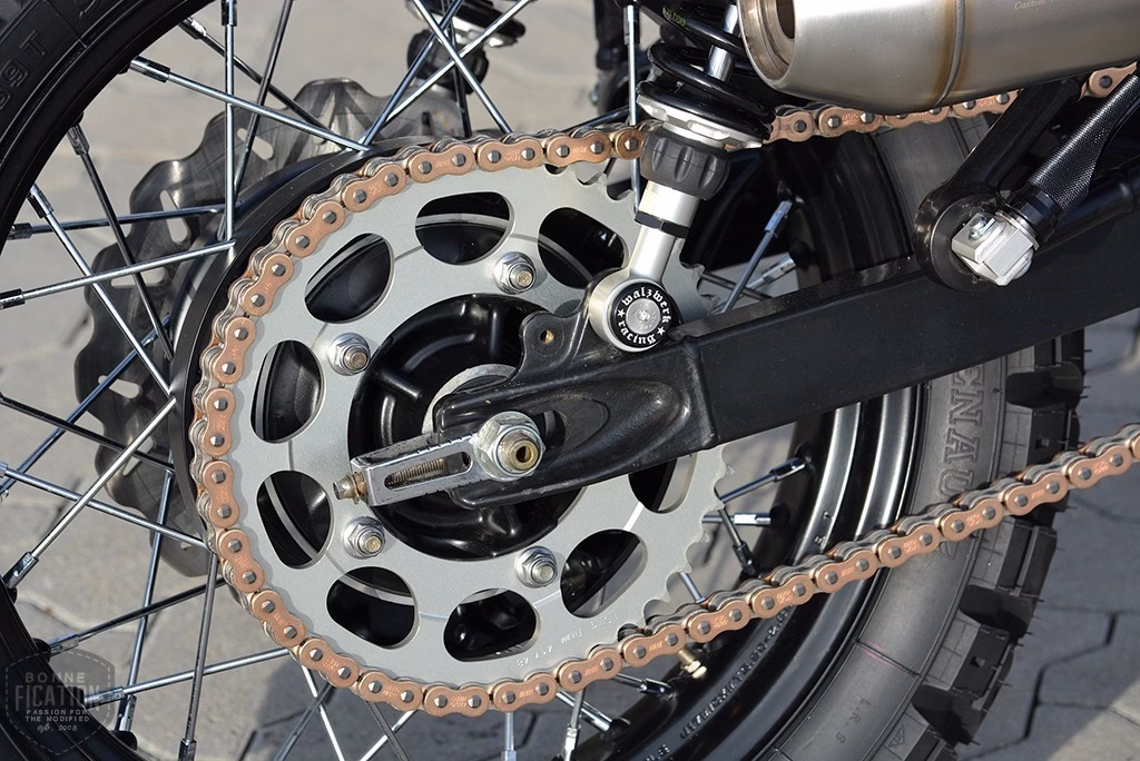 In contrast to the tank, the alloy mudguards and JVB side covers were finished in flat black to match the new 2015 Triumph Scrambler wheels (which came off a previous project.) fitted with Galfer Wave Discs, and shod in Heidenau K60 Scout’s (150/80-17 rear and 120/70-19 front).