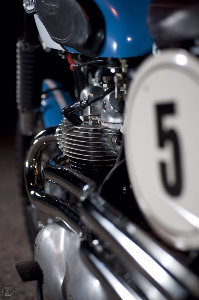 On reassembly the T100 SC was lightened and rebuilt as a period Desert Racer including new hi-pipes, reshaped mudguards, wider MX bars, knobby tires, fork gators and number board, much as if it had sprung from the workshops of California based JoMo or Teds Triumph’s.