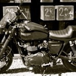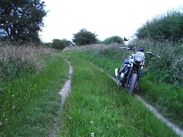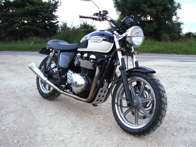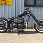 Lots of homemade parts fabricated in my shed from aluminium bought from a leading d.i.y. store-chainguard, sprocket cover, headlamp brackets and mini indicator brackets. Cost pennies compared to buying plus the satisfaction. Thruxton front mudguard bought cheap from online auction site, i had to drill the fork brace to secure it. Rear mudguard is from same auction site, was off a scrambler, i trimmed it and bobbed it, light is usual generic custom item. Bars are 3″ rise widened with use of sawn off bits of bar held in place with rawl bolts(this works well in damping out vibes). Mass engineering tacho bracket bought cheap online modified to take speedo. Bash plate half price online too!