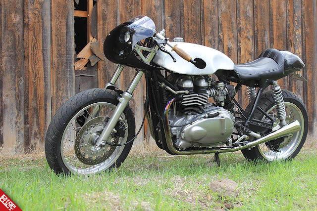 Other mods, accessories, cool parts, etc: Custom Tank from Richard Phelps at TabII classics, Aftermarket Thruxton Glass bubble seat that was cut, shaved and hacked from Airtech, The upholstery was done by my local secret guy that I brought a picture to of the most ghey looking Italian shoes that I could find and had him copy it; other than that — All kinds of stuff!