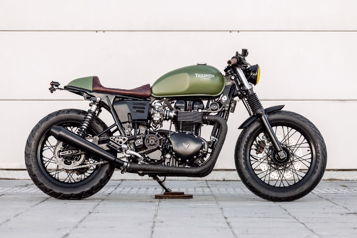 The teams latest creation the ‘Lady Speed’, which is based on a locally sourced 2007 Carb model Thruxton, with just 5,000km on the clock was built for Jarl from Norway, who contacted Jose and Tito earlier in the year wanting them to build a Café Racer, Macco Style — Jarl only criteria for the finished Triumph Twin, was that it needed to be inspired by the matt green of the Morgan Three-wheeler car.