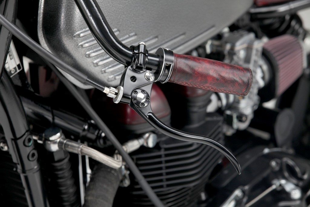 Unlike many custom Triumph Twins, the Forty has received a whole lot of love in the engine & power department, including a drive belt kit from Freespirits “Bigger intake and exhaust engine ducts, Lower engine head, and a Higher compression ratio”… along with a Thruxton Cup engine tune. The engine has then been finished off with a set of Keihin FCR39 carburettor paired with a Rustom built exhaust with Biltwell micro silencers. Finishing the engine off are a set of Speed Merchant ribbed side covers, matching nicely with the tank, frame and fork detailing. With that added power comes the need for added braking, so at the front the stock blocks of wood have been replaced with a Brembro 340mm Big brake kit and custom brake lines.