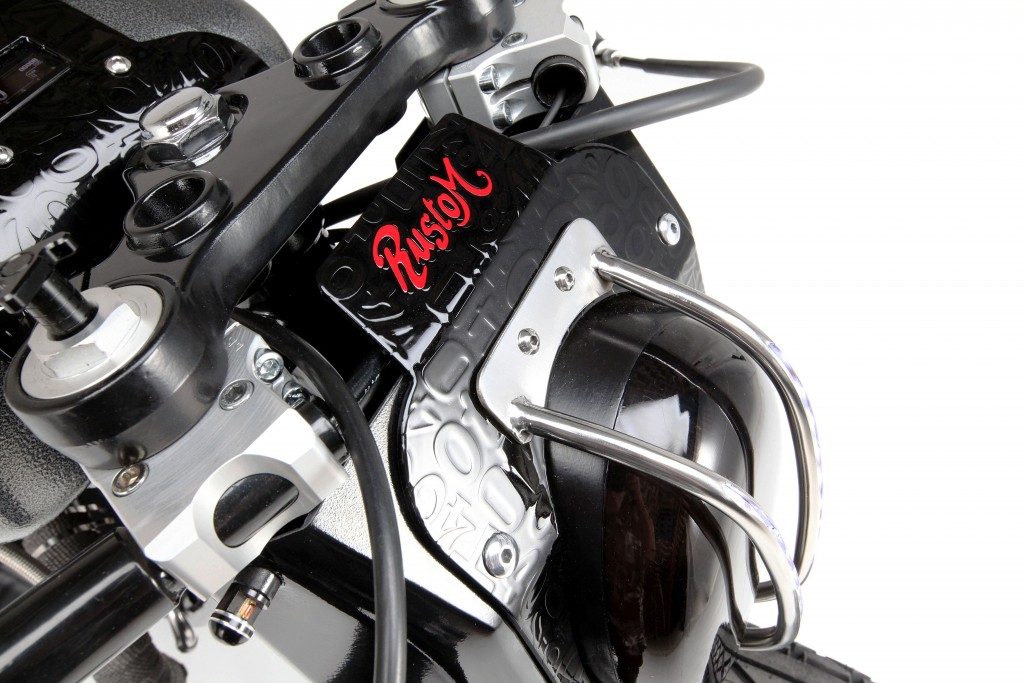 Grips which in-turn have fitted to a Rustom made board-tracker handlebar, attached to the bikes using LSL handlebar clamps. The bars also sport a set of Kustomtech brake and clutch controls, as well as a set of Motogadget switches, tied into a Motogadget M-unit and on to a Lithium battery which has been hidden under the seat cowl. At the front of the bike resides a Rustom made LED headlight and LED turn signals.