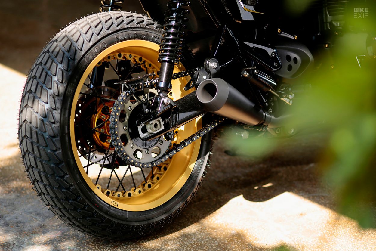 The choice of tires is another area where this custom build shines. The wheels are fitted with Heidenau K73 supermoto tires, a popular choice among riders seeking excellent traction and durability. These tires are designed to offer a perfect balance between road performance and off-road capability, making the Speed Twin versatile and adaptable to different riding conditions. The gold-painted rims not only complement the bike’s black and gold theme but also add a touch of sophistication, further highlighting the custom nature of this build.